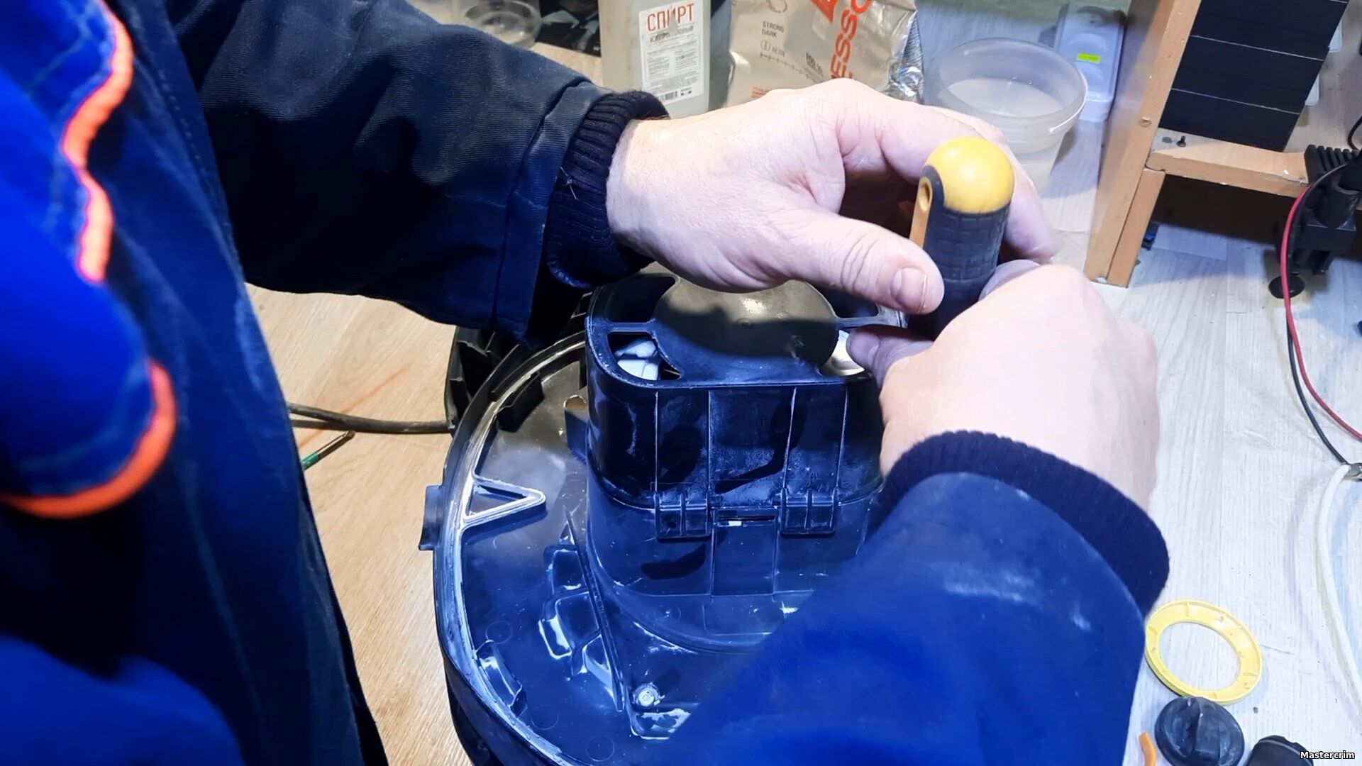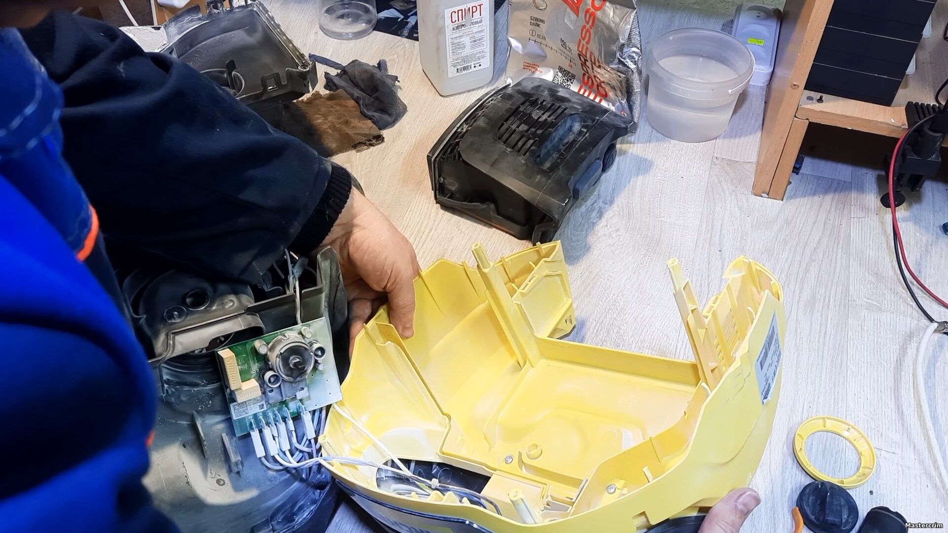 Далее снимаем верхнюю часть головы пылесоса, полностью она не отойдёт ибо будет ограничена проводами к розетке.