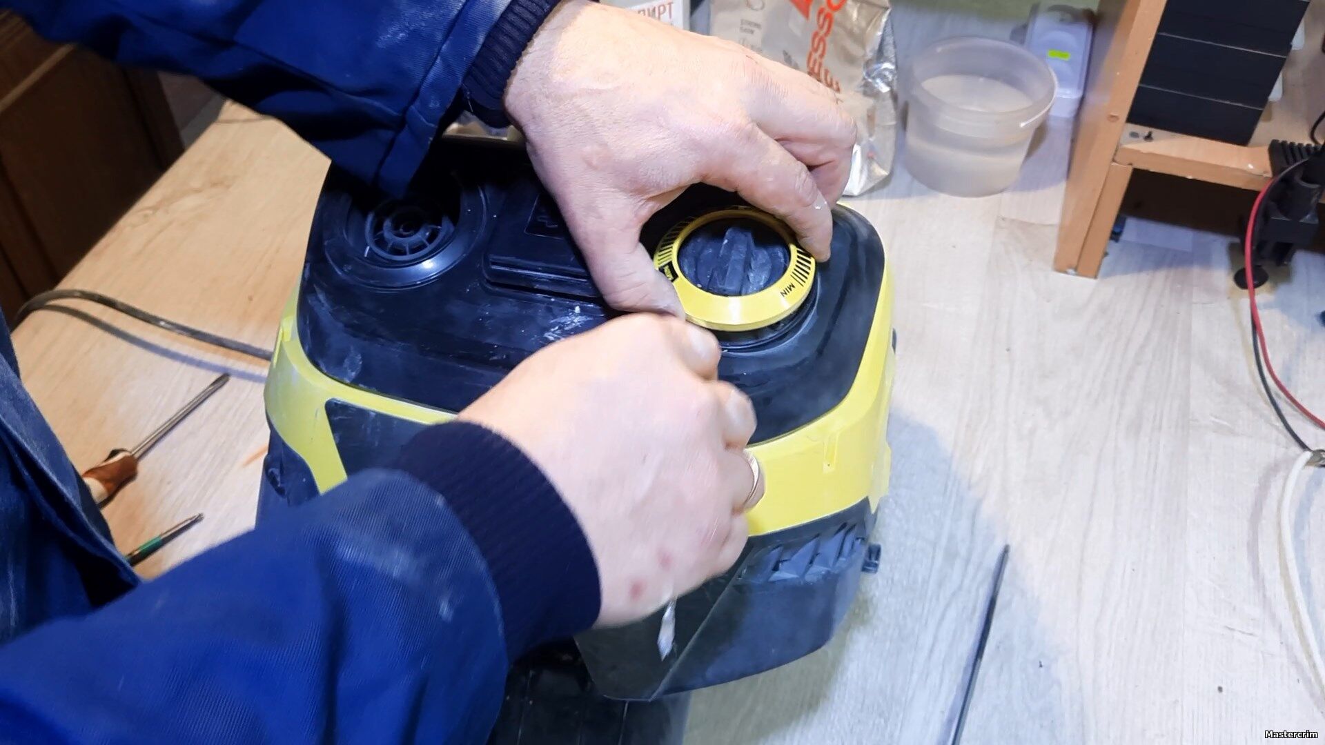 В ремонт поступил пылесос строительный Karcher WD 6 P V-25822T 1.628-313.0 который не включается, пользователь см снимал мотор и определил что мотор при этом исправен. Для определения неисправности разбираем пылесос, для чего откручиваем винты с нижней части головы, их там шесть штук: