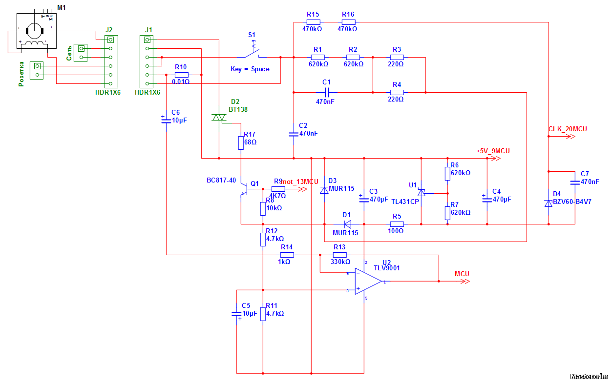 Таким образом, в автоматическом режиме, при подключении нагрузки, ток нагрузки проходя через резистор R10, вызывает падение напряжения которое многократно усилившись, поступает на MCU. MCU определив наличие нагрузки в розетке, включает через драйвер Q1 симистор D2, который подаёт питание на мотор пылесоса. после снятия нагрузки, с небольшой задержкой происходит отключение мотора. | |